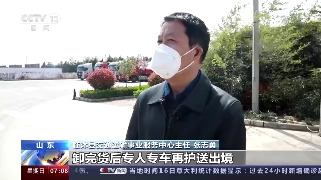 临沭县交通运输事业服务中心主任 张志勇:消杀查验合格后,由企业派专人专车带着接驳函,点对点接到收发货目的地,完成闭环接驳,卸完货后专人专车再护送出境。