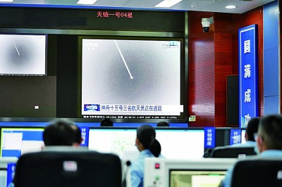 在北京航天飞行控制中心大厅屏幕上可以看到,飞船内的3位航天员严阵以待,他们时而调整身姿,时而与地面确认技术状态。