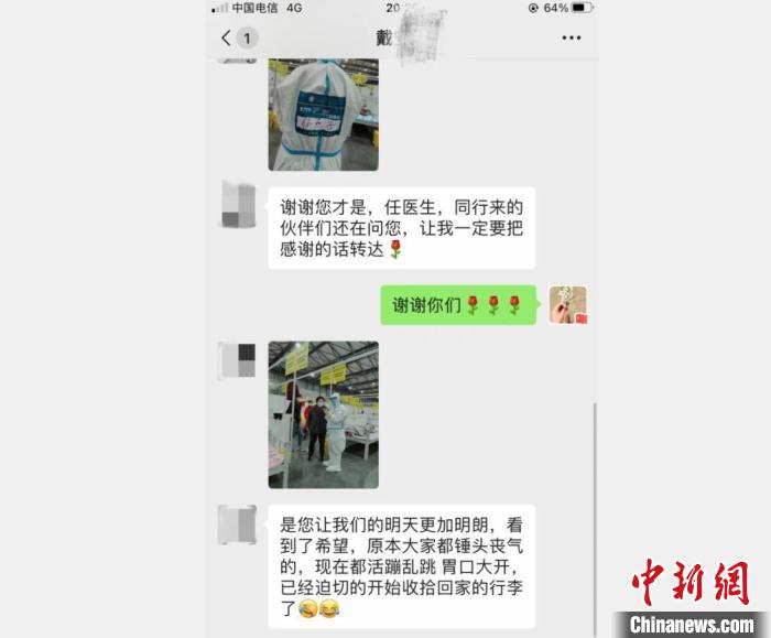 “我只是做了一名医生该做的,能尽己所能帮助到她,我也很高兴。”4月17日上午,记者再次联系到休整中的任燕子医生,“昨天晚上,戴女士得知今天康复出舱,担心不能和我道别,特意在微信中留言,并发过来祝福视频,真的,很感动、也很受鼓舞!”任燕子医生向记者转发了视频和微信聊天截图,表示一定会珍惜这份珍贵“友情”,更加坚定走好接下来的援“沪”抗疫路,并与在“沪”各医疗队和广大上海市民“心连着心、肩并着肩”一起努力,争取早日赢得胜利。