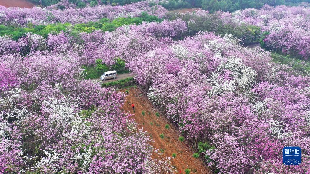 4月17日,在广西柳州市柳北区下陶村,农民在盛开的洋紫荆苗木林里劳作(无人机照片)。