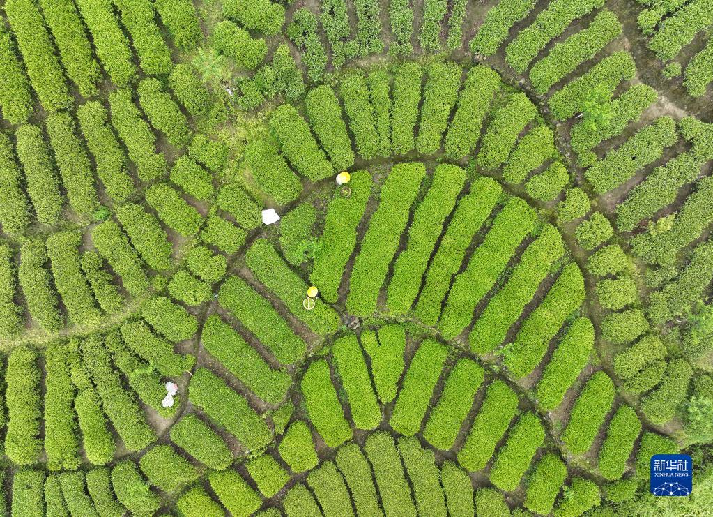 4月17日,茶农在湖北省宜昌市秭归县茅坪镇一生态茶园采摘“谷雨茶”(无人机照片)。