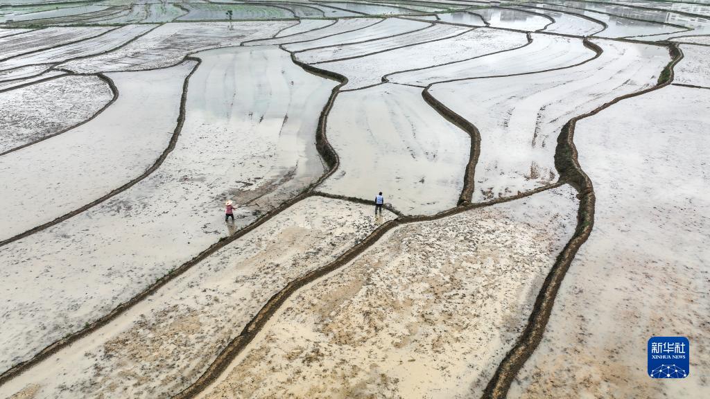 4月17日,湖南省郴州市嘉禾县晋屏镇宅侯村村民在梯田上犁田劳作。