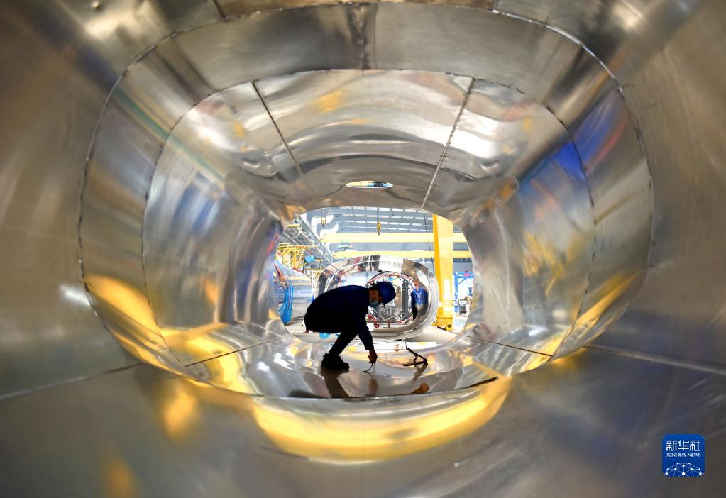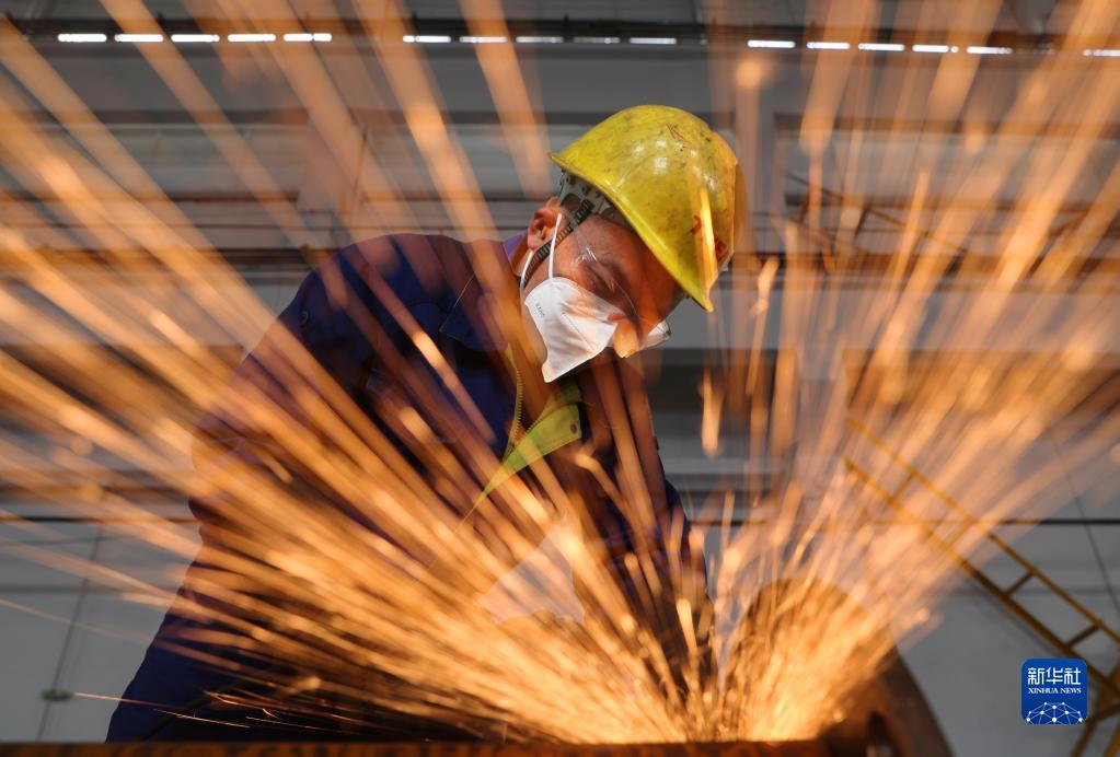 4月18日,在湖南省衡阳市,特变电工衡阳变压器有限公司工人进行打磨作业。