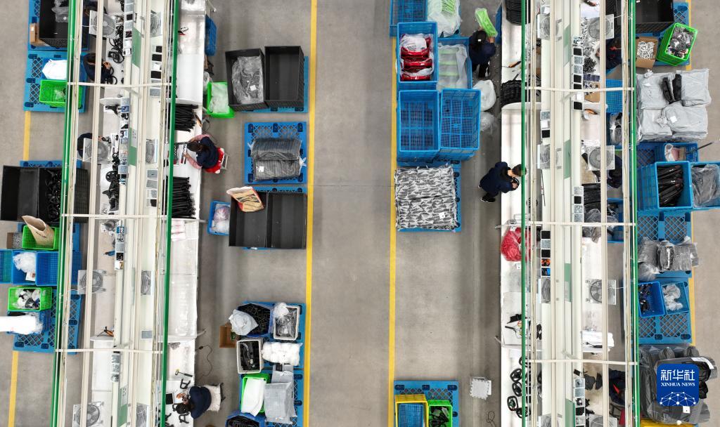 4月18日,工人在安徽全椒经济开发区一童车企业的生产线上忙碌(无人机照片)。