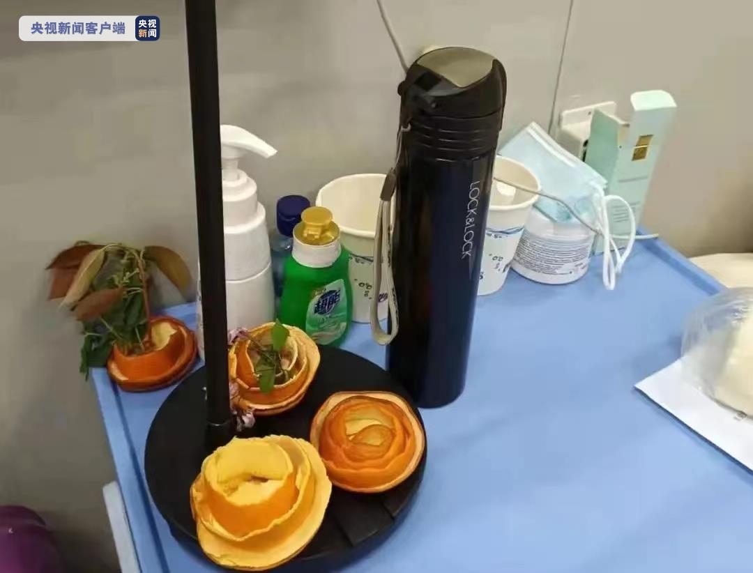 此时丁静怡也关注到了这位阿姨的床头柜。她把橘子吃剩下的皮,做了两朵玫瑰花,摆在黑色的小台灯旁,倍感温馨和浪漫,采摘了几朵海棠放在其中,更增添了几分生机。因为被这美丽的画面震撼到,丁静怡下意识地去找了个纸杯,修剪了一个小小的底座,放了点水,把“玫瑰花”小心地移入纸杯底座,有了水的滋养,怒放的海棠更加娇艳。