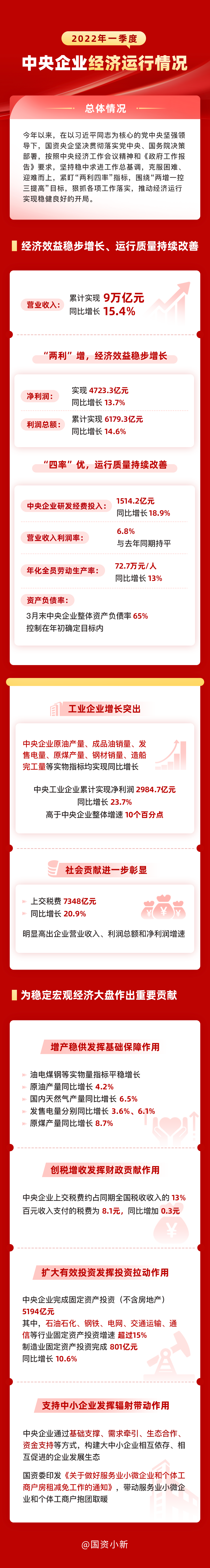 时刻新闻 —分享— 4月19日,国务院新闻办公室在北京举行新闻发布会,请国务院国有资产监督管理委员会秘书长、新闻发言人彭华岗介绍2022年一季度中央企业经济运行情况,并答记者问。 一 图 看 懂 2022年一季度中央企业经济运行情况 来源:国资小新 编辑:黄河