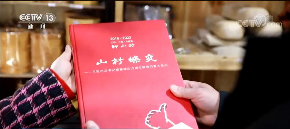 大家看,我手里有一本画册,这本画册反映了2016年到2022年神山村的山村“蝶”变。翻开画册我们可以看到神山村发生了翻天覆地的变化,丛林掩映、白墙黛瓦、美不胜收。从最早的照片到现在,短短5年时间,就发生了非常巨大的、幸福的变化。打动我们的还有许多点,在这个画册当中体现出来的村民的精气神,他们脸上洋溢着像花儿一样的满满幸福感。所以有人就说,如今的神山村和过去贫困的神山村相比,如今是糍粑越打越黏,日子是越过越甜。