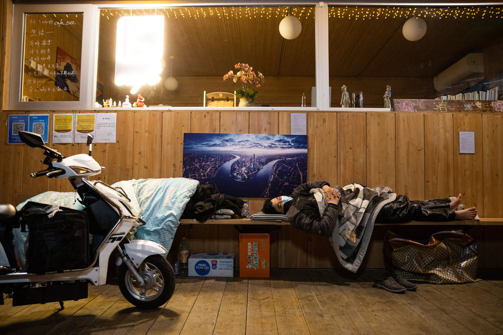 ↑4月20日午夜,在上海市武宁路桥下平房,因疫情封控无法回到小区的快递小哥在休息。