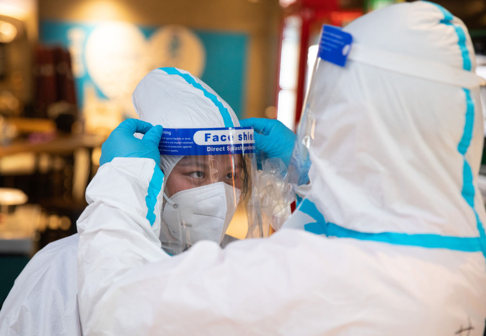 ↑4月15日,在上海长宁区盒马星空广场门店,逆行的“Z世代”夫妻曹冉(右)帮徐清秋佩戴防护面罩。曹冉和徐清秋夫妇是盒马成都一家门店的员工,两人都是“Z世代”的年轻人。4月13日原本是两人约定拍婚纱照的日子,小两口一商量,临时决定取消了婚纱照的拍摄,一起随团队前往上海,帮助上海门店加速恢复运转。他们说:“夫妻一起上阵,反而没牵挂、负担,可以做更有意义的事。”他们期待上海疫情早日结束,可以在上海度蜜月。