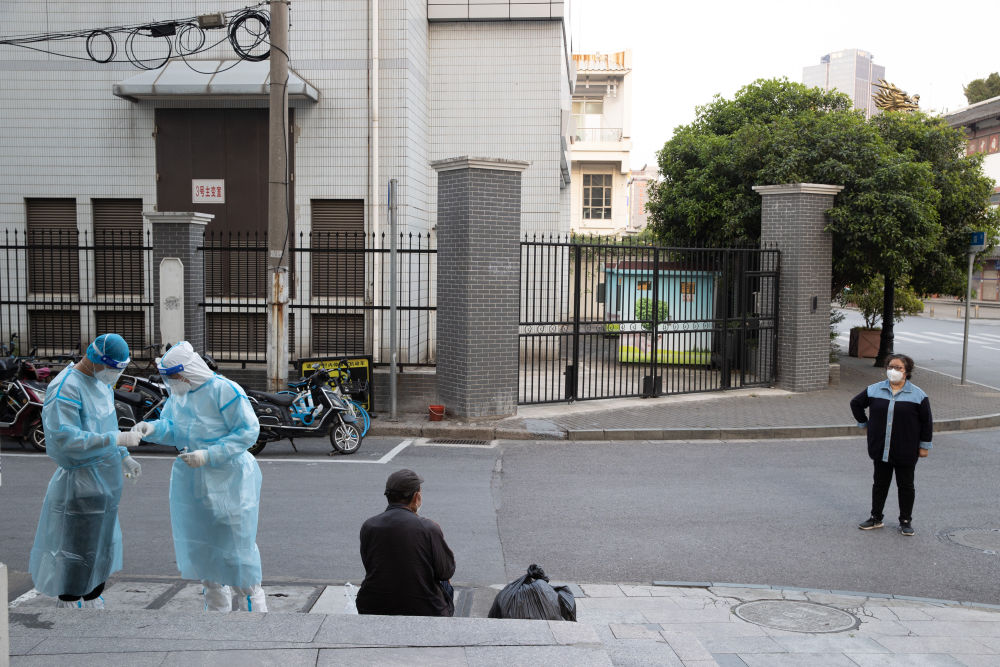 ↑4月1日,在上海市长宁区江苏路街道岐山居民区,工作人员为居民进行核酸采样。
