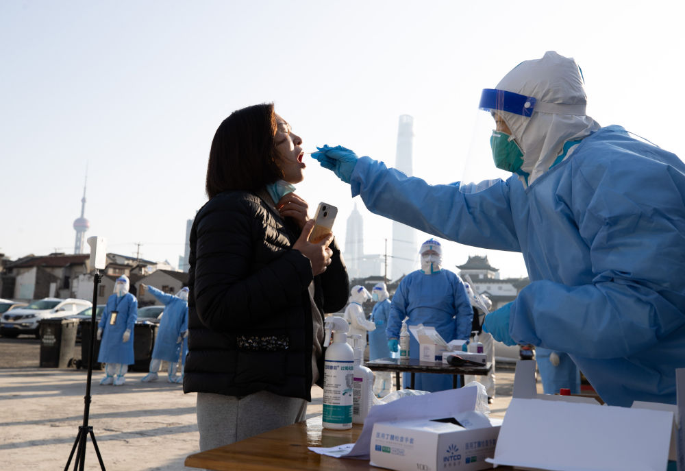 ↑4月4日,在上海市黄浦区豫园街道,工作人员为居民进行核酸检测采样。