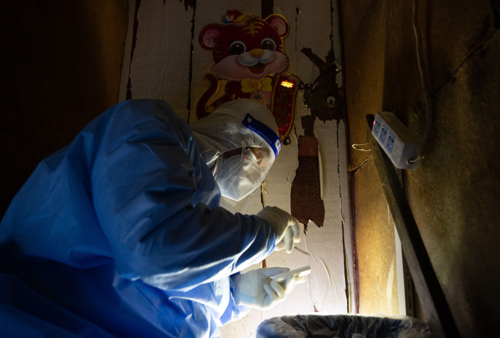 ↑4月11日,广福居委会工作人员为一位路过的流浪人员做抗原检测。