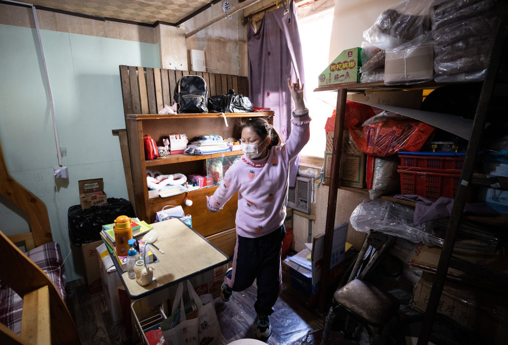 ↑4月8日,8户11人中唯一一名小学生龚悦在家中上体育课,按照老师要求模仿动物进行活动。