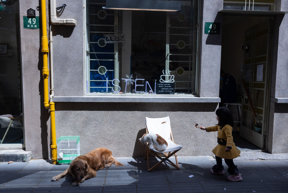 ↑3月29日,在上海市徐汇区高安路一家咖啡店门口,一名小女孩在逗猫。