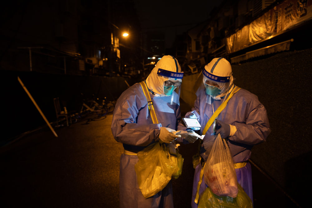 ↑4月15日凌晨,小东门街道社区卫生服务中心抗疫人员周欣逸(右)和毛志益于4月14日23点接到任务,要对21个家庭进行核酸复筛。他们一直工作至凌晨4点,共完成16个家庭24个人的复筛。