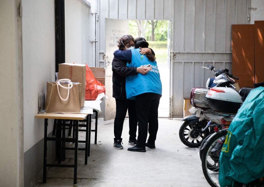 ↑4月17日,豫园街道宝带居民区党总支书记张萍(右)探望广福居民区党总支书记杨树萍,两人紧紧拥抱在一起。杨树萍安慰张萍:“我们拼命地干,一起努力,一定能把这个疫情控制住。”
