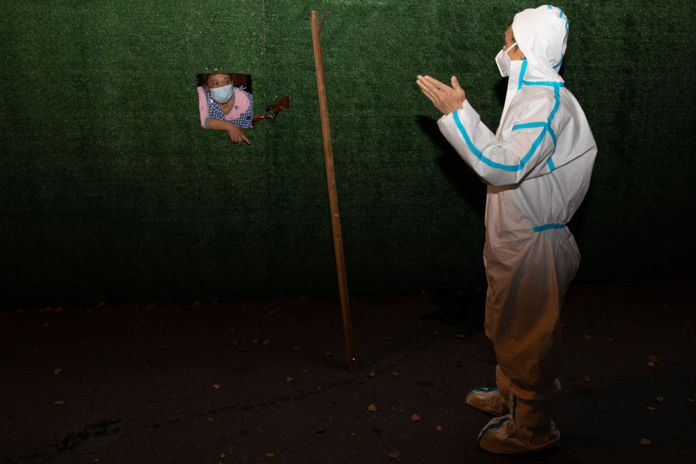 ↑4月14日,豫园街道工作人员李建国(右)在广福居民区和一位封控在家的住户沟通垃圾处理问题。