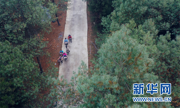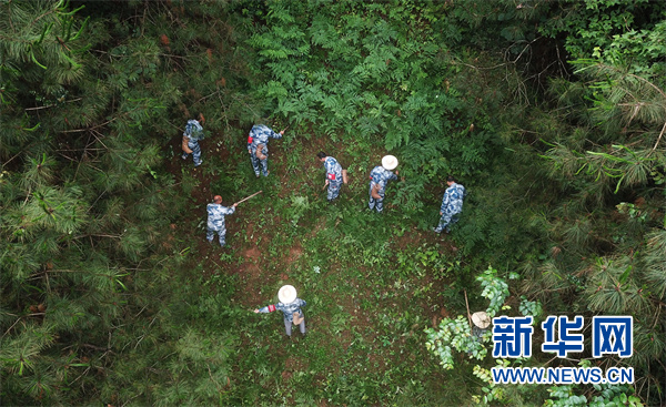 贵州锦屏春蕾林场的护林员们在清除防火线上的杂草(2019年6月13日无人机拍摄)。新华社记者 杨文斌 摄