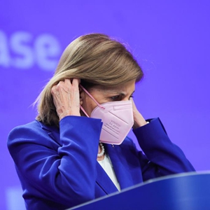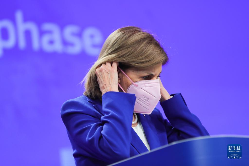 4月27日,在比利时布鲁塞尔,欧盟委员会负责卫生和食品安全事务的委员基里亚基季斯在记者会后戴上口罩。新华社记者 郑焕松 摄