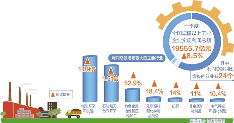 国家统计局4月27日发布的数据显示,一季度全国规模以上工业企业实现利润总额19555.7亿元,同比增长8.5%,继续保持平稳增长态势。