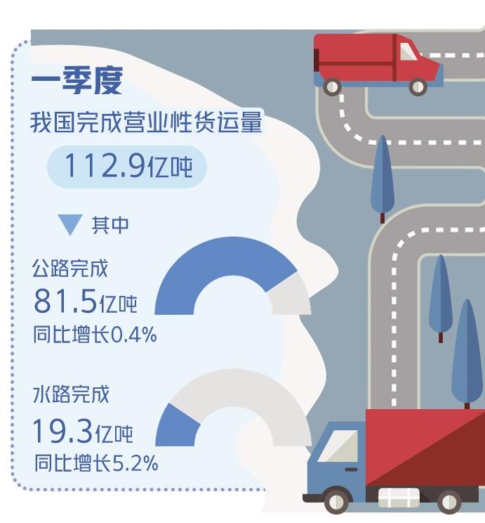 近日,交通运输部发布数据显示,一季度我国完成营业性货运量112.9亿吨,同比增长1.5%,增速与去年四季度基本持平。其中,公路完成81.5亿吨,同比增长0.4%;水路完成19.3亿吨,同比增长5.2%。