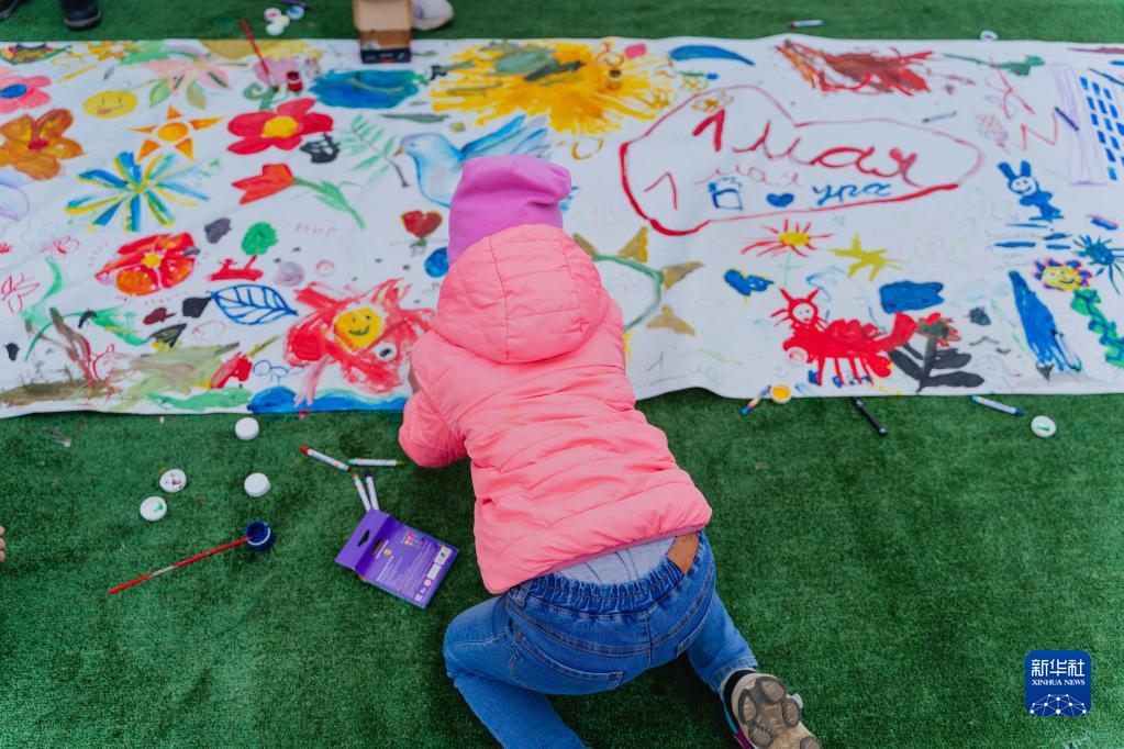 5月1日,在俄罗斯滨海边疆区首府符拉迪沃斯托克,一名儿童参加节日绘画活动。