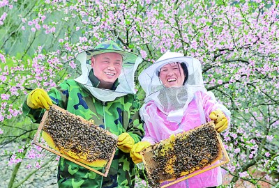 江西萍乡上栗镇万石村大冲里养殖合作社,养蜂户龙汝开、钟红艳正在收割蜂蜜。邓建萍摄/光明图片