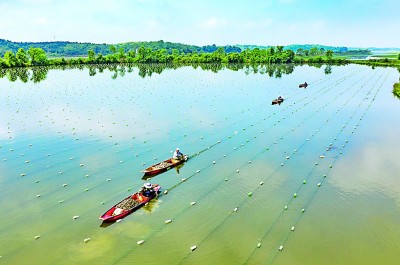 蚌农在江西九江都昌县新妙湖珍珠养殖基地投放珍珠蚌。傅建斌摄/光明图片