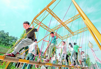 湖南株洲茶陵县的茶乡花海,一群小孩子正在欢快地荡秋千。胡艳波摄/光明图片
