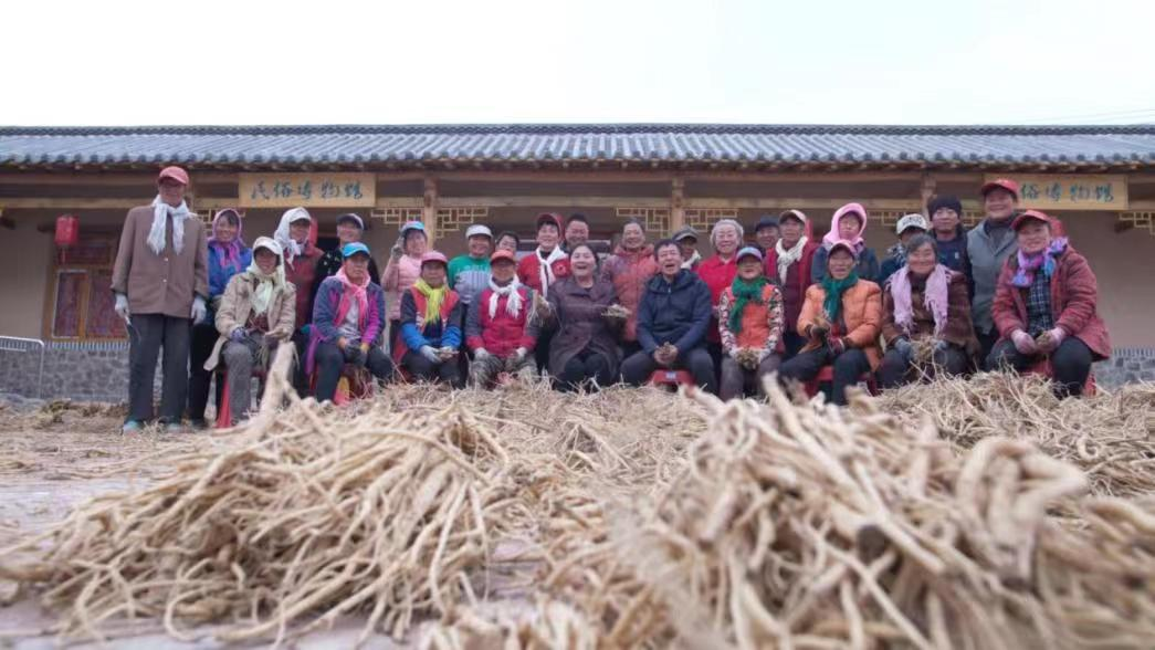 2019年10月,小庙子村种植的桔梗喜获丰收。赵会杰与种植桔梗的部分村民在民俗博物馆前合影。受访者供图