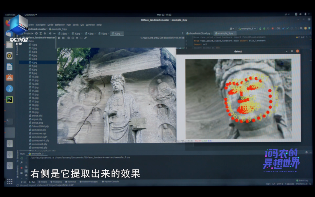 和人脸识别技术类似杨溯的佛脸识别模型需要大量的数据样本进行学习为此,杨溯寻找了安岳石刻保存完好的佛头为它们留下肖像照每张都提取了68个标记点用来描述佛像的所有面部特征他把这些面部数据信息