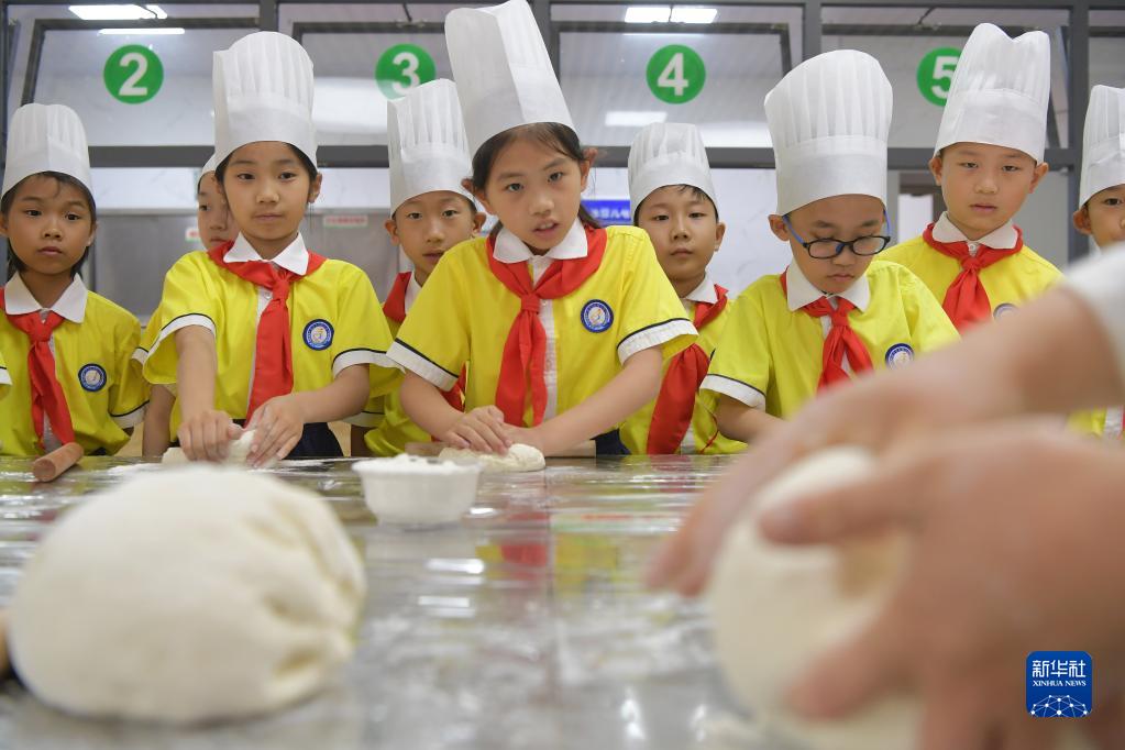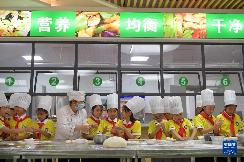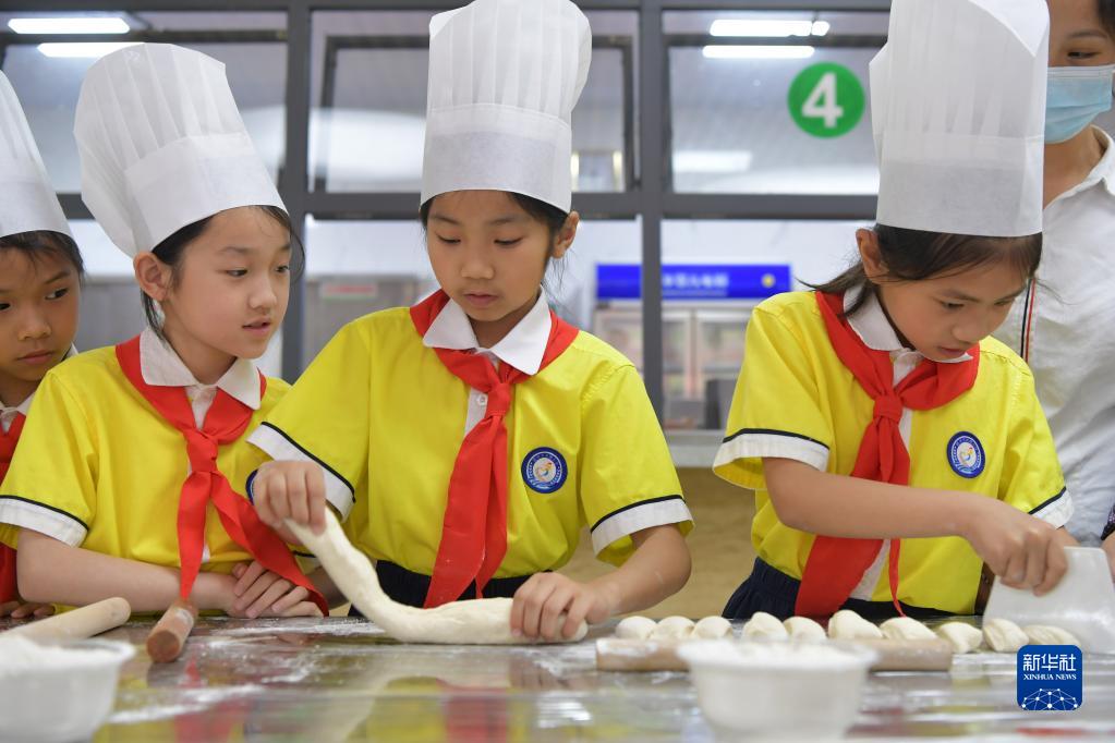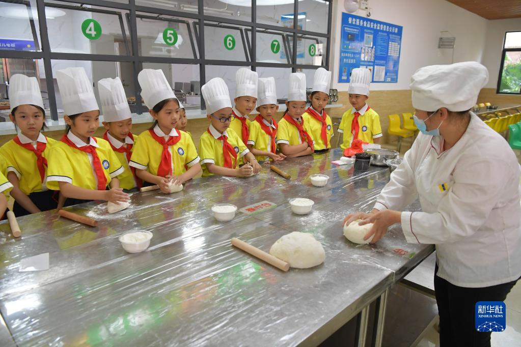 在江西省赣州市蓉江新区武陵小学,学生在烹饪课上学习制作面点(5月11日摄)。