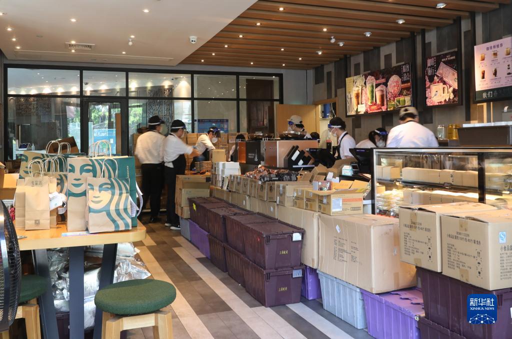 5月17日,位于上海市徐汇区一家咖啡店的工作人员在制作网络订单货品。记者从5月17日举行的上海市新冠肺炎疫情防控新闻发布会上获悉,上海全市16个区都已实现社会面清零。新华社记者 方喆摄