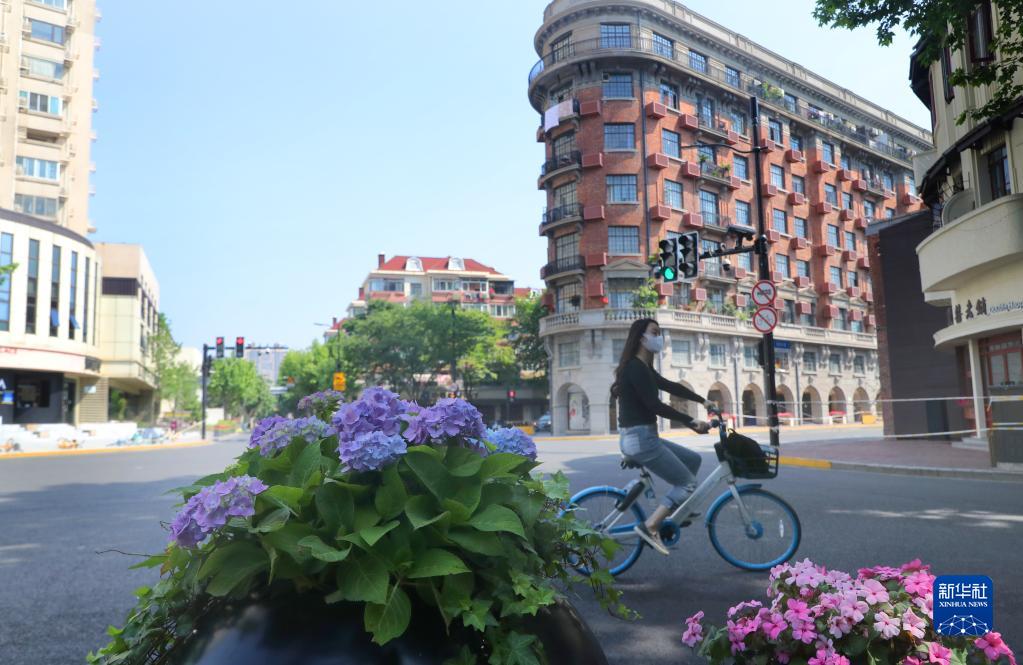 5月17日,市民骑车从武康大楼前经过。记者从5月17日举行的上海市新冠肺炎疫情防控新闻发布会上获悉,上海全市16个区都已实现社会面清零。新华社记者 方喆摄