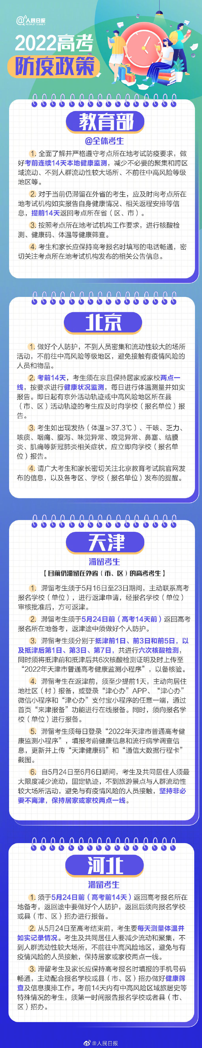 还有不到3周,多地2022年高考就将拉开大幕。近日,各地根据疫情形势,陆续发布高考防疫提示。滞留外地高考生如何返回考试?考前需要几次核酸?高考生需要哪些健康证明?31个省区市高考防疫政策汇总,转发提醒!愿你执笔为剑,金榜题名!