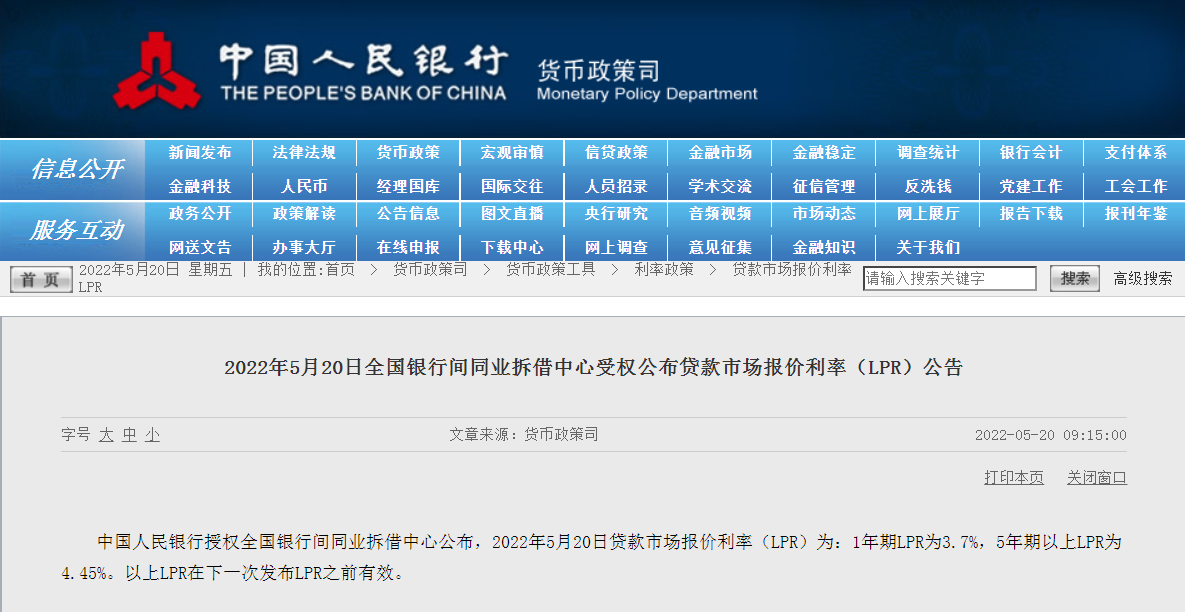 LPR迎来“降息”。5月20日,中国人民银行授权全国银行间同业拆借中心公布,最新一期贷款市场报价利率(LPR)为:1年期LPR为3.7%,5年期以上LPR为4.45%。