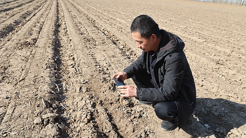孙京军正在为家庭农场联合体成员录制播种验收情况视频。(受访者供图)