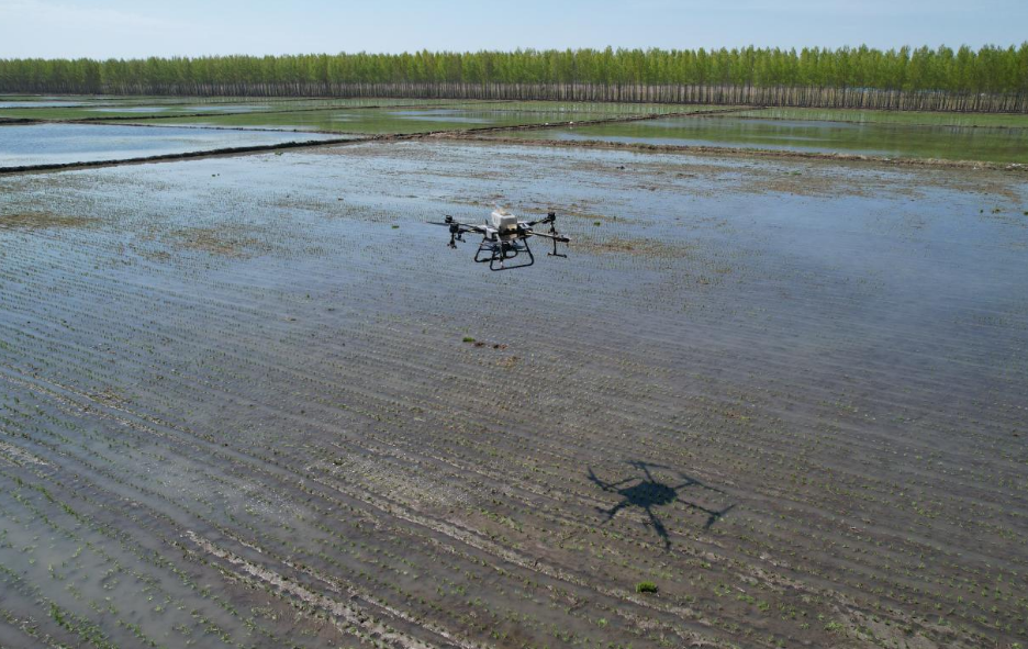 无人机的应用让种地从面朝黑土变成了仰望蓝天。在北大荒集团繁荣种畜场有限公司第三管理区水田里,满载肥料的无人机在田野上空翻飞翱翔,种植户冯涛正利用无人机进行施肥作业。这架无人机以每小时150亩的速度作业,喷出的肥料像白雾一样均匀,使每株秧苗都能“雨露均沾”。