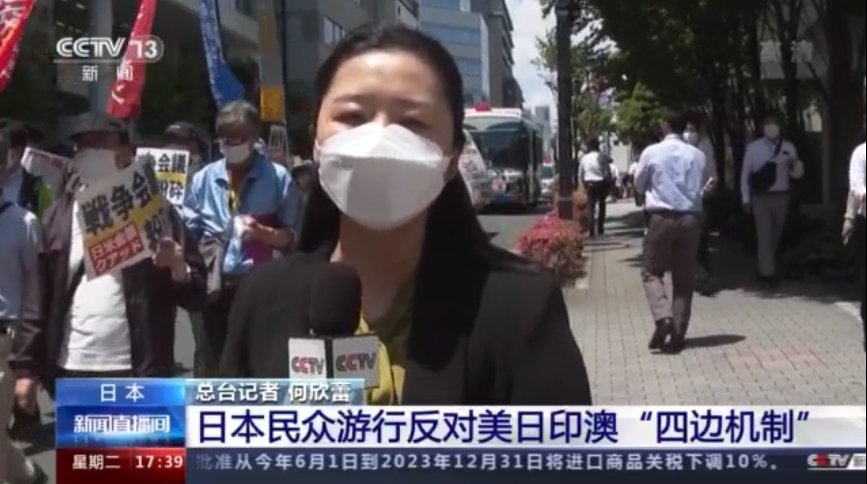总台记者 何欣蕾:在现场,有日本民众手拿着条幅上面写着,反对“四边机制”峰会,反对战争会议,以此来表达对于美日印澳推进的所谓“四边机制”的不满和反对。