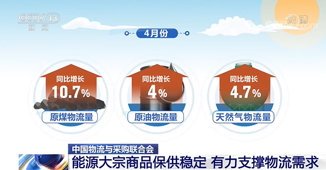 从结构看,能源、大宗商品保供领域保持稳定,对物流需求形成有力支撑。4月份,原煤、原油、天然气等能源物流量同比分别增长10.7%、4%和4.7%;钢铁、有色金属等领域物流需求实现持续增长。高技术制造需求增长引擎作用继续显现,其中太阳能电池等新材料产品物流量继续保持高速增长态势,增速超过20%;计算机、通信和其他电子设备制造业增长4.9%,新动能韧性依然较强。