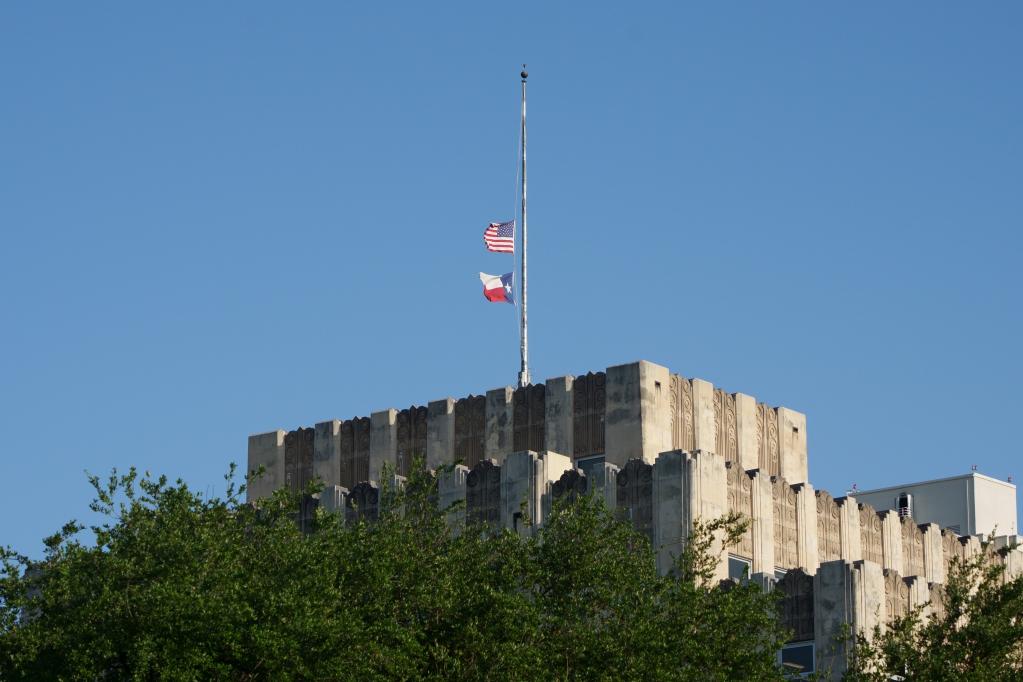 5月24日,位于美国得克萨斯州首府奥斯汀的一栋政府大楼降半旗,向枪击事件遇害者致哀。(新华社发,李波 摄)