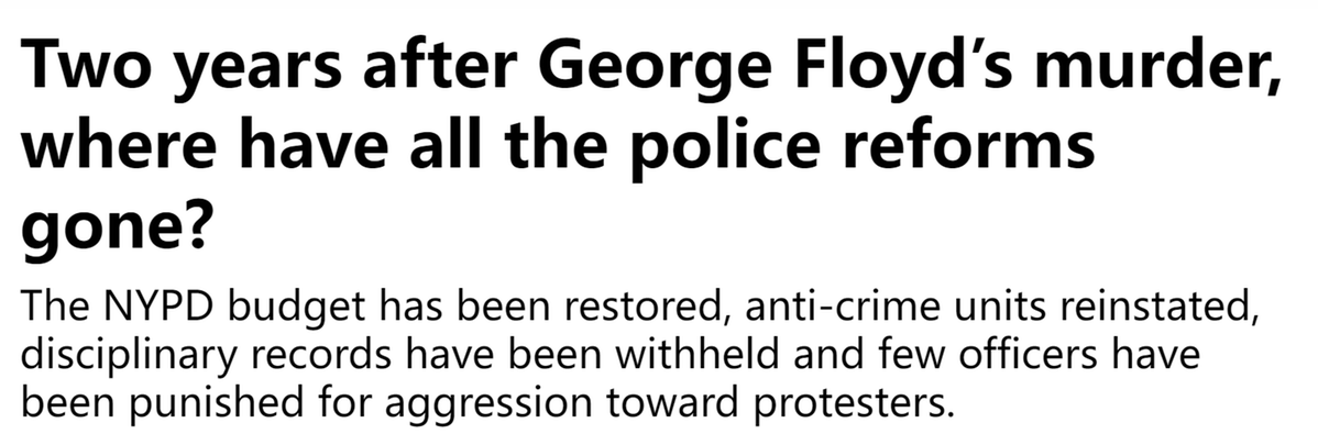 两年过去了,美国警察体制改革依然遥遥无期。当地时间5月23日,美国媒体City & State也在文章中质问:“所有的警察(体制)改革都去哪儿了?”文章指出,纽约警察局的预算已经恢复,很少有警察因为对抗议者的攻击而受到惩罚。