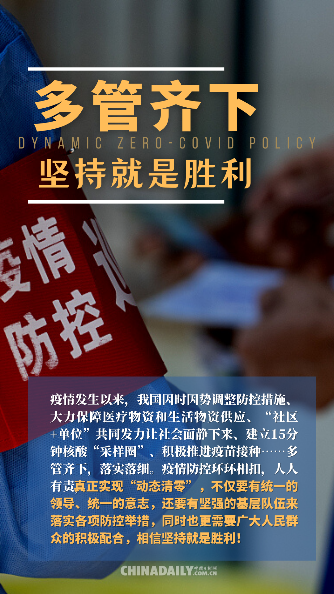 当前,新冠大流行远远没有结束,奥密克戎毒株还在不断变异。这是加紧努力的时候,而不是“躺平”放松的时刻。“逆水行舟,不进则退”,这种情况下,中国坚持“动态清零”,正是对全球疫情防控最大的负责任。而两年来的疫情处置实践也证明,我们有能力实现“动态清零”,因此,我们不仅要有十足的底气,更要对未来充满信心,从日常核酸检测,填报流调信息等小事做起,筑牢疫情防控的每一道关卡。相信,坚持就是胜利!