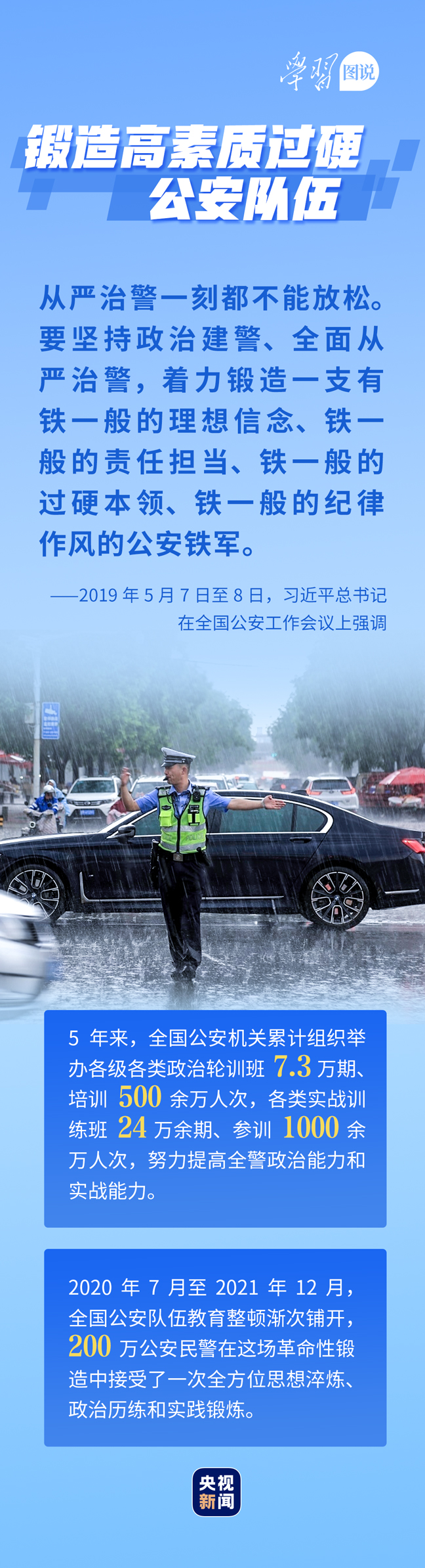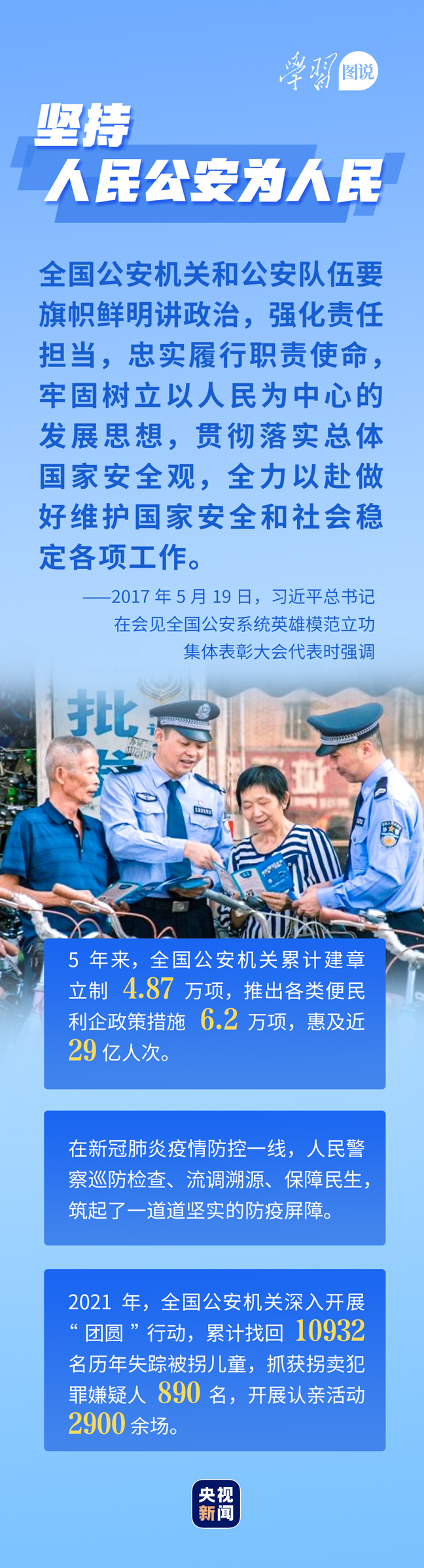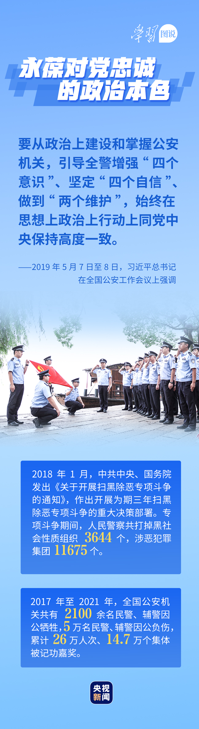 全国公安机关坚持以习近平新时代中国特色社会主义思想为指导,深入贯彻习近平法治思想,忠实践行对党忠诚、服务人民、执法公正、纪律严明的总要求,用辛勤的汗水乃至宝贵的鲜血和生命,为国家安全、社会公共安全、人民生命财产安全筑起了一道坚不可摧的铜墙铁壁。