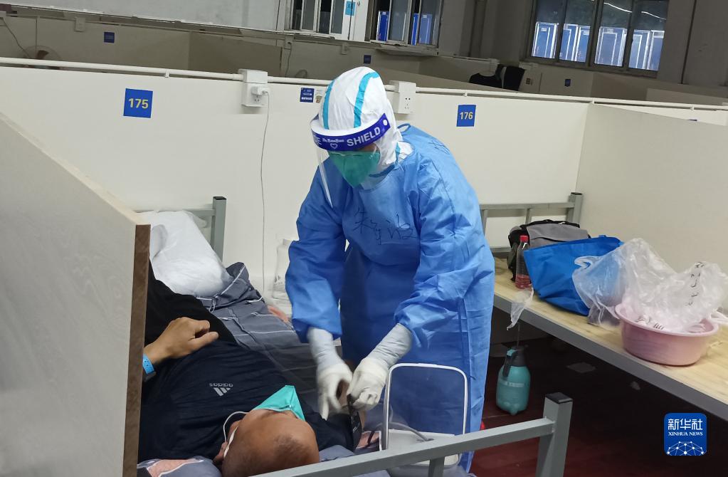 在上海市嘉定区南翔方舱医院,海南省三亚市妇幼保健院ICU护士朱海波在照顾患者(5月12日摄)。新华社发(受访者提供)