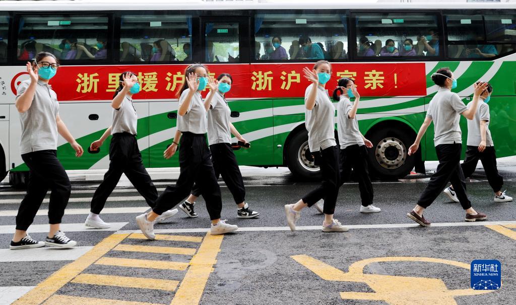 浙江省援沪医疗队队员列队走过停放在位于上海市浦东新区驻地外的大巴旁(5月24日摄)。当日,浙江省援沪医疗队圆满完成援沪任务启程返浙。新华社记者 方喆 摄