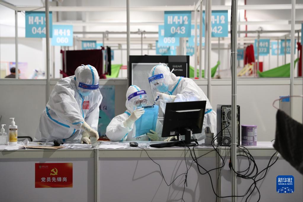上海世博展览中心方舱医院的医务人员在工作(4月11日摄)。新华社发(刘晓晶 摄)