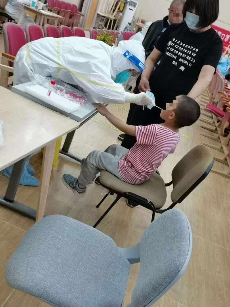 近期北京连日高温,在昌平社区核酸检测点,小汤山医院康复中心三团支部书记刘紫涵被防护服罩着,探着腰半蹲在桌前,N95口罩里传出她沙哑的声音,“小朋友,再把嘴张大一点点”。