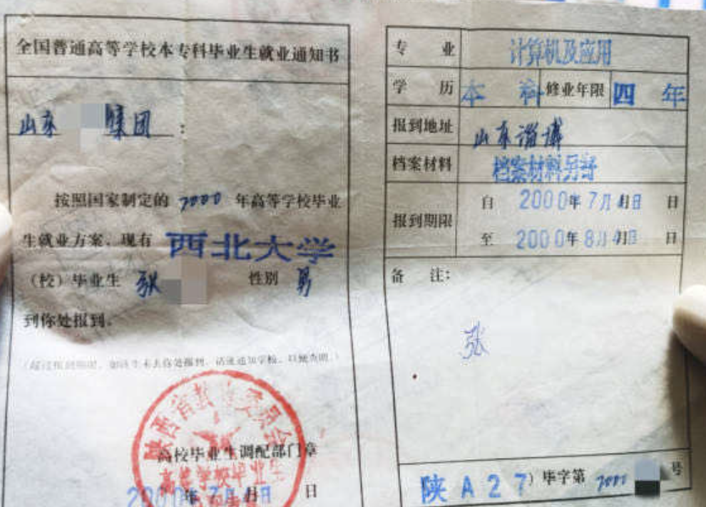 通知书上写着:山东某某集团:按照国家制定的2000年高等学校毕业生就业方案,现有西北大学(校)毕业生张某某性别男到你处报到。底下还盖着红戳戳的“陕西省教育委员会高等学校毕业生分配专章”。落款是2000年7月4日。