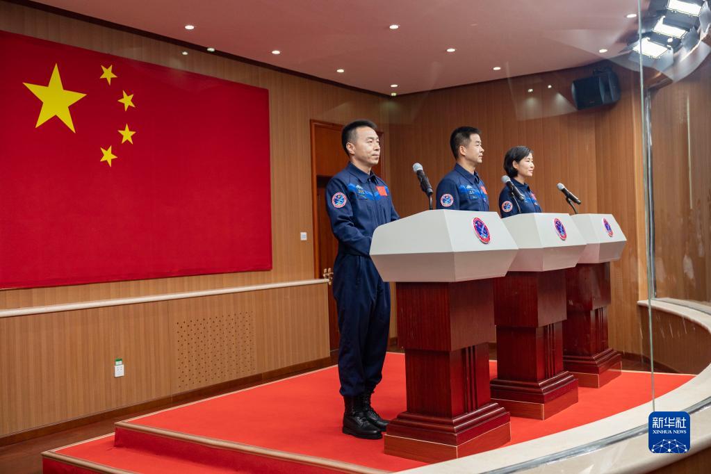6月4日,执行神舟十四号载人飞行任务的3名乘组航天员陈冬(中)、刘洋(右)、蔡旭哲在酒泉卫星发射中心问天阁与媒体记者集体见面,并回答记者提问。新华社记者 才扬 摄